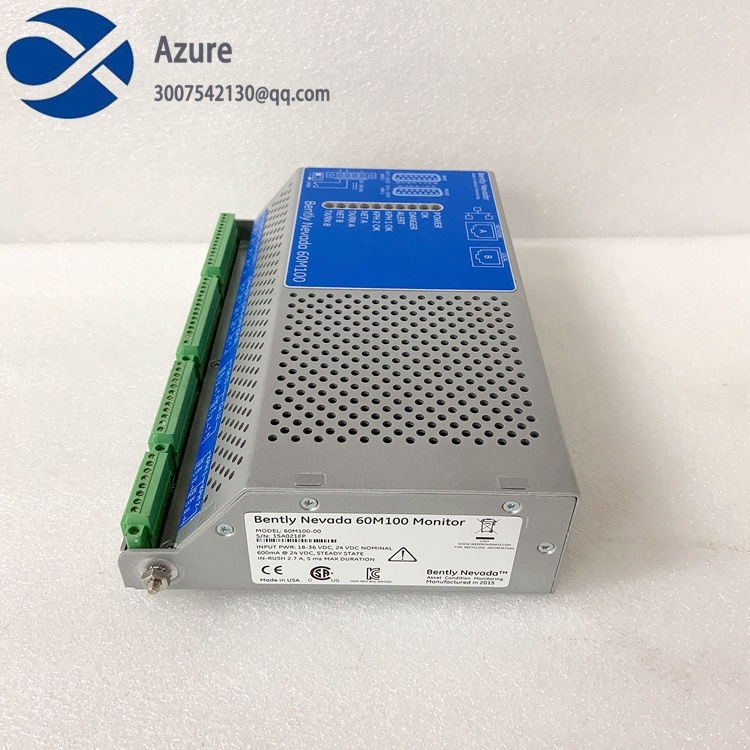 Asynchronous Waveform 8192 samples, 320 ms Synchronous Waveform 8192 samples: 4 revolutions, 2048 samples/rev 8 revolutions, 1024 samples/rev 16 revolutions, 512 samples/rev 32 revolutions, 256 samples/rev 64 revolutions, 128 samples/rev Spectrums –Main Bearing 8 revolutions, 1024 samples/rev 3200 lines Sync Enveloped –Gearbox Stages 3200 lines Sync Enveloped 3200 lines Sync High Res Number of revolutions and samples per revolution vary based on the selected asset. –Generator Inboard / Outboard 64 revolutions, 128 samples/rev 3200 lines Sync Enveloped 3200 lines Sync High Res –Tower Sway 15.625 Hz, 200 lines Anti-Alias -80 dB minimum Update Rate 30 seconds Historical Data Storage Rate 4 hours Data Storage 2 weeks (typical, no alarms) Keyphasor Signal Inputs Speed Range 1 to 120,000 rpm; limited to 2,000 rpm for wind turbines Speed Resolution 1 to 100 rpm ± - 0.1 rpm 100 to 2000 rpm ± 1 rpm Gap ±8.2 mV typical ±22.3 mV worst case Supported Transducers Acceleration Channels TurningPoint TP100 Accelerometer Keyphasor Channels Turck Ni8–M18T–AP6X7M, externally powered Bently Prox Probes Oil Particle Sensors GasTOPs Macom Proximity Channel (for Shaft Crack Detection) Bently Prox Probe 3300 XL 11mm Environmental Operating Temperature Range -40 C to +70 C (-40 F to 158 F) Storage Temperature Range -45 C to +85 C (-49 F to 185 F) Relative Humidity 0% to 95% non-condensing operating and storagePollution Degree Pollution Degree 2 (working voltage < 30 Vrms or 60 Vdc) Physical Dimensions 8.88 X 5.89 X 2.17 inches (225 X 150 X 55 mm) (See 60M100 Monitor Overall Dimensions on page 9.) Weight 1.4 kg (3 lbs) Mounting DIN rail msounting.