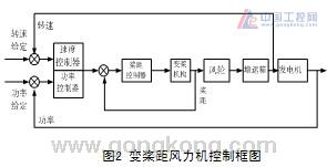 如图2所示为变桨距控制器的原理框图。在发动机并入电网之前由速度控制器根据发动机的转速反馈信号进行变桨距控制,根据转速及风速信号来确定桨叶处于待机或顺桨位置;发动机并入电网之后,功率控制器起作用,功率调节器通常采用PI(或PID)控制,功率误差信号经过PI运算后得到桨距角位置。