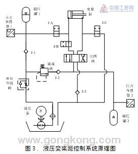 本文实验中采用国外某知名风电公司风力发电机组作为实验对象,其额定功率550KW,采用液压变桨系统,液压变桨系统原理图如图3所示。从图3中可以看出,通过改变液压比例阀的电压可以改变进桨或退桨速度,在风力机出现故障或紧急停机时,可控制电磁阀J-B闭合、J-A和J-C打开,使储压罐1中的液压油迅速进入变桨缸,推动桨叶达到顺桨位置(90�)。