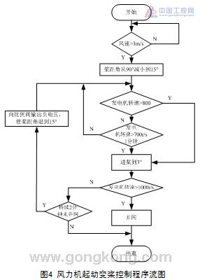 风力机起动时变桨控制程序流程如图4所示。当风速高于起动风速时PLC通过模拟输出单元向比例阀输出1.8V电压,使叶片以0.9�/s的速度变化到15�。此时,若发电机的转速大于800r/min或者转速持续一分钟大于700r/min,则桨叶继续进桨到3�位置。PLC检测到高速计数单元的转速信号大于1000r/min时发出并网指令。若桨距角在到达3�后2分钟未并网则由模拟输出单元给比例阀输出-4.1V电压,使桨距角退到15�位置。