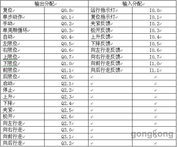 本设计采用了奥越信224CCPU(自带14DI/10DO)为主控,对注塑机械手进行编程控制,基本单元、外接特殊单元和特殊模块的数量最多不超过7个。采用PLC控制的最大特点就是体积小,功能强,响应速度快,可靠性高。不需要对硬件环境做大的改变,随时可依生产工艺的不同要求而修改,并具有可扩展性。下图为I/O分配表,用户可根据该表进行编程(仅供参考,可根据现场另行修改)